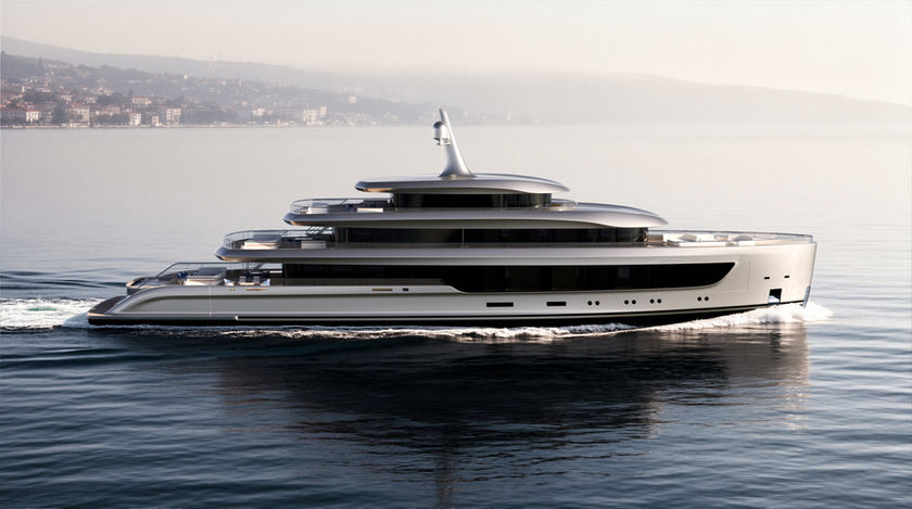Karros is a 60-metre motor yacht concept conceived entirely through the lens of automotive design — from crease lines that pull every surface into tension, to a novel approach to the hull that allows the guest suites to run the full beam of the yacht with windows dropped to deck level.